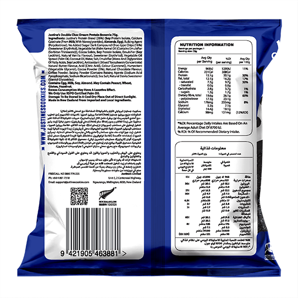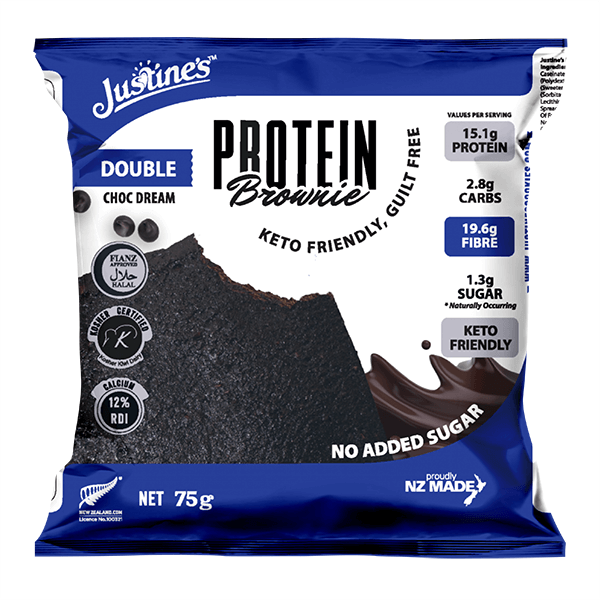 Justine’s protein blend (34%) (egg,soy protein isolate, calcium caseinate (milk), almonds), erythritol, humectant (vegetable glycerol), no added sugar dark compound choc-type chips (15%) (sweetener (maltitol), vegetable fat (fractionated hydrogenated palm kernel oil (contains emulsifier (sorbitan tristearate))), cocoa solids, soy protein isolate, emulsifier (soy lecithin), natural flavour), cocoa (4.5%), canola oil, chocolate flavour, bulking agent (polydextrose), coffee powder, baking powder (contains raising agents [sodium acid pyrophosphate, sodium bicarbonate]), sea salt.